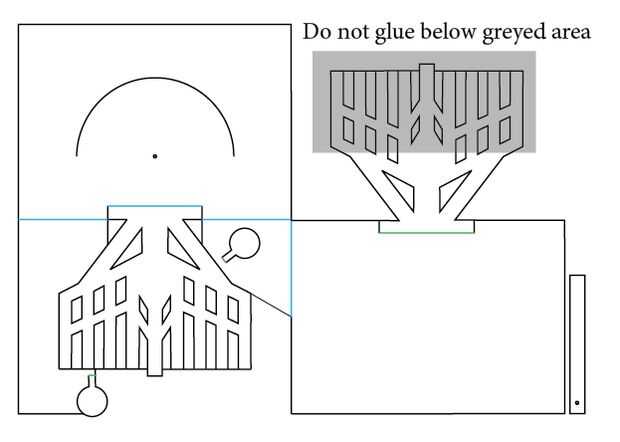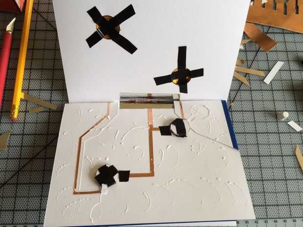 Cinta vacía Gelt papel monedas para cubrir las dos cortan círculos en la tarjeta exterior, luego doblan y pegar la tarjeta exterior a la pop-up, por lo que la Gelt cubre las 2 baterías (quizá quieras probar el circuito primero--si usted había orientado los LEDs mal, no hay mucho que puedes hacer ahora, pero si pones sólo la batería de forma equivocada se puede todavía Dale la vuelta). En el lado de la vela, asegúrese de que sólo pones pegamento fuera de ese círculo: no quieres pegar el circuito a la cubierta, que evite la vela de circundar y prender las velas una por una.