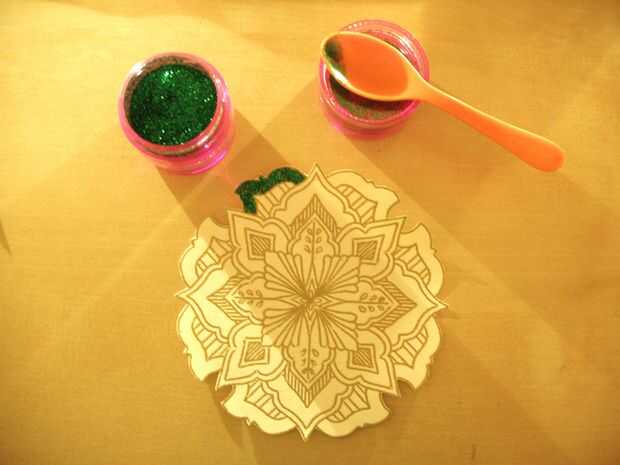 Use el lápiz de pegamento aplicar pegamento a la zona que desea para brillo. Luego aplicar brillo a la zona de la cola. Me resulta más fácil aplicar brillo utilizando una cuchara pequeña, esto minimiza la cantidad de exceso brillo producido. Como con el polvo de grabación en relieve, aplicar brillo sobre un trozo de papel de modo que cualquier exceso se puede volver a la olla.