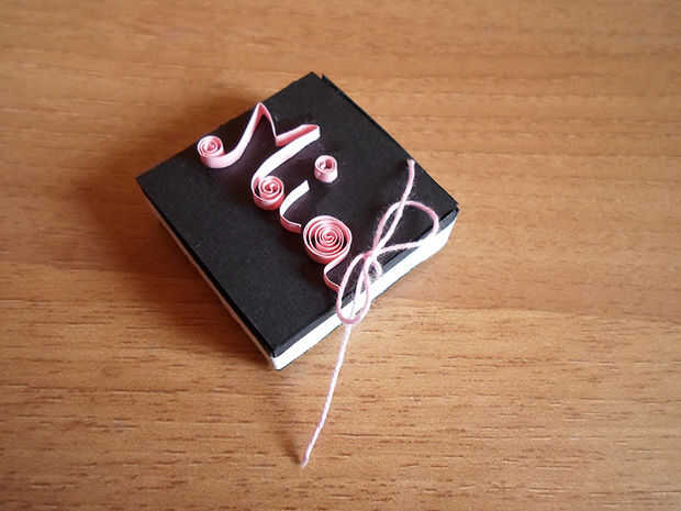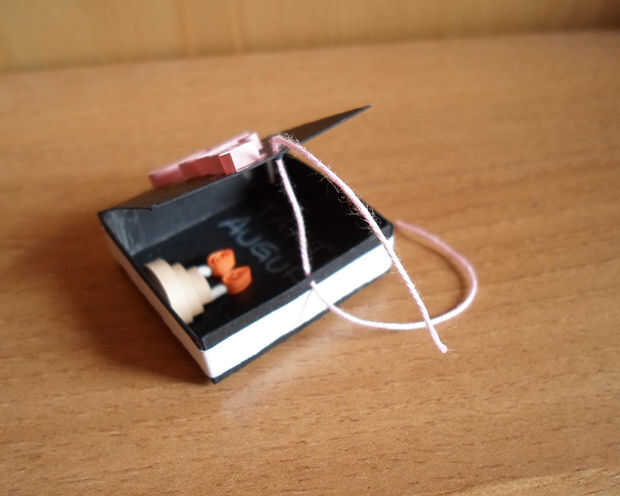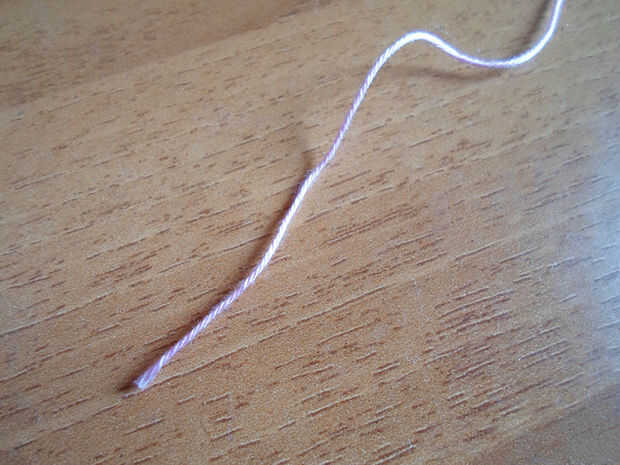 Corte un trozo de hilo rosa (debe ser lo suficientemente grande para que puedas hacer un arco con él), pasar a través de ambos agujeros y hacer un arco.