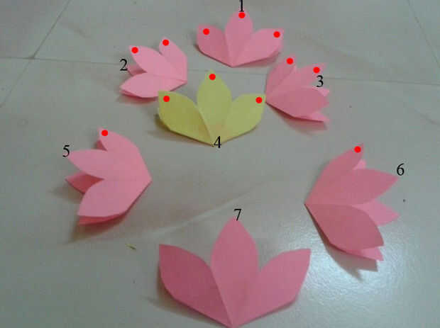 4) pegar el pegamento en la primera flor y pegar 2 º y 3 º como sabio. Aplique pegamento en el punto rojo y pegar uno por uno...