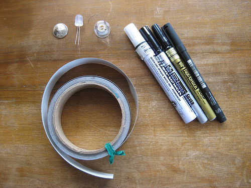 Este proyecto fue creado para de YuKonstruct Chibitronics construir noche y utiliza una etiqueta de efectos Chibitronics y tres pegatinas de LED.La pegatina efecto tiene tres pastillas: + y – para poder y una señal que genera el patrón. El botón de s