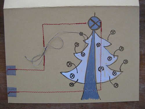 A partir de la ficha de conductor inferior puntada hacia adelante y hacia atrás y entonces a través a la Navidad del árbol de tronco y luego hasta la parte superior y terminar la puntada doblando detrás en sí mismo al menos una vez.