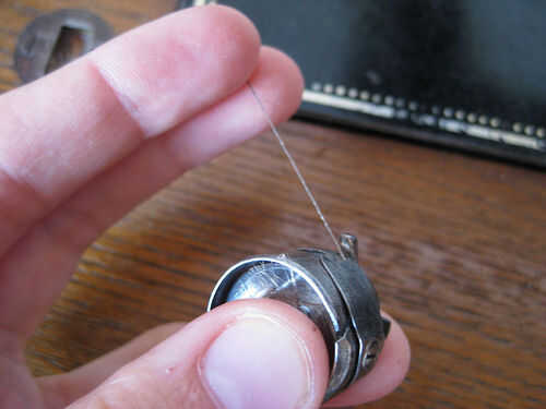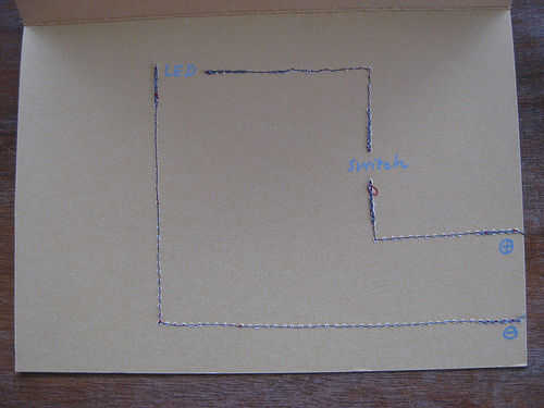 Ahora puede recortar fuera de todos los hilos sueltos, excepto los del interruptor. Aquí usted puede acortar el hilo regular no conductor, pero no los hilos sueltos de la conductoras. Estos trajeron a la parte delantera de la tarjeta y atados a un arco. Cerrar el interruptor y completar el flujo de electricidad aunque el LED.