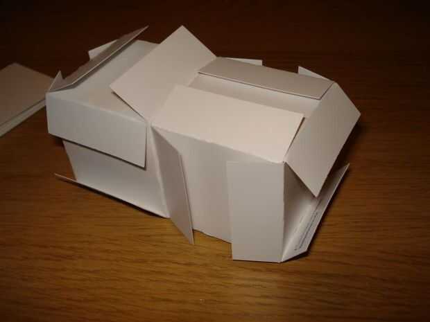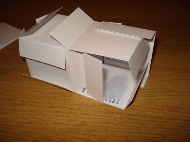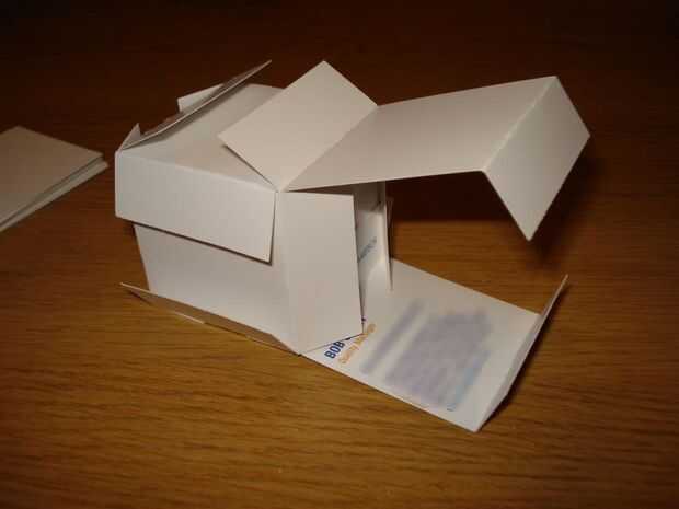 Me pareció mucho más fácil de construir el segundo cubo ya conectado al primer cubo. De las fotos se puede ver que las dos primeras cartas son metidas directamente en las aletas del cubo anterior. El resto de las cartas se añaden alrededor de este como tal como estaban para el primer cubo.