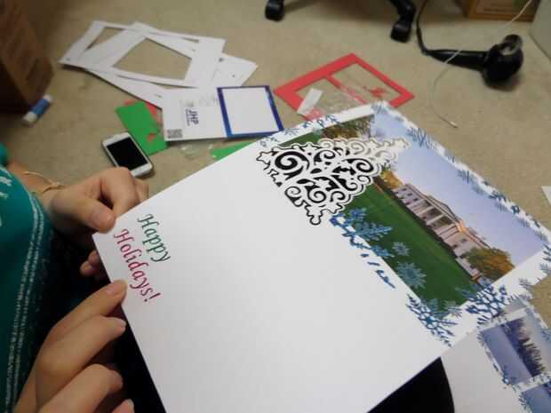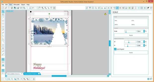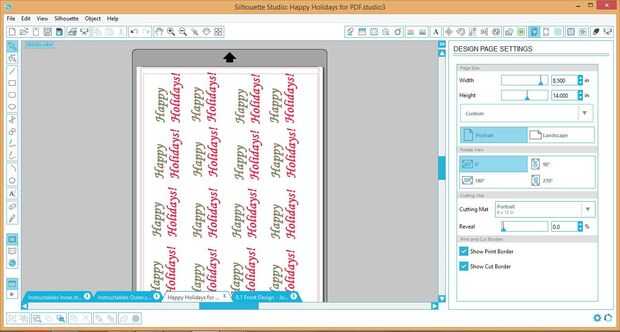 Una vez finalizado ese paso, elegí una fuente de estudio de la silueta para escribir "Felices fiestas" en la esquina inferior derecha de cada tarjeta. He utilizado un patrón de relleno en el interior de las palabras e impreso el mensaje de saludo en otra hoja de papel. Entonces seleccioné "canto" que corta el contorno de las palabras hacia fuera. El impresas "felices fiestas" va pegadas bajo el corte parte del mensaje "felices fiestas". Esto se explicará más adelante en el paso de la Asamblea.