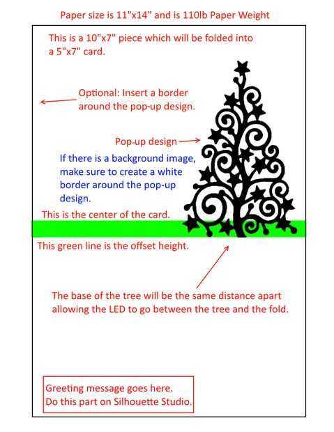 Para crear el pop-up, primero determiné lo ancho el LED de 5 mm fue y cuánto del doblez el LED iba a ser, que era.4 pulgadas. (Estudio de silueta estaba en pulgadas - no cambié la configuración por defecto ya que tengo Paint.NET también en pulgadas). Utilizando este número, yo sabía que el diseño emergente es necesitado baja esta cantidad de distancia para permitir lo pop-up para compensarse de lo LED. Además, sabía que en la parte superior de la tarjeta (para el árbol) o los dos lados de la tarjeta (para el copo de nieve) es necesario apoyar los brazos que tanto desde el propio diseño. Puede tomar un poco de edición de su diseño para que los brazos de soporte ajuste discretamente.