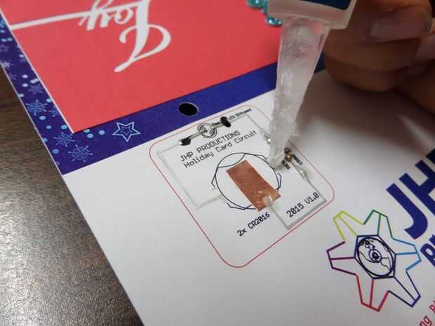 Entonces, para colocar el clip de la batería en el circuito, añada una gota de pegamento a los tres de las cuatro fichas (que se cortaron con la silueta), porque están expuestos a la tarjeta de pvc por debajo. La pestaña de la batería se asegura a la tarjeta de PVC. Asegúrese de que el pegamento se haya secado completamente y puede insertar las pilas y la tarjeta de prueba. He añadido un poco de desnudo conductivo a la cuarta pestaña para asegurarse de que la electricidad puede fluir a través.