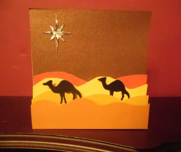 Por último, cortar un pedazo de oscuro coloreada tarjeta de papel del mismo tamaño que la parte delantera de la tarjeta de Ready-Made. Pegue abajo. Pegar en su creación 3D. Cortar una estrella de un pedazo de tarjeta plata y pegar en el fondo. También puede usar un sello y tinta para la estrella.