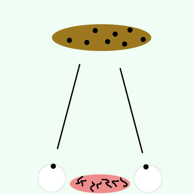 Una rápida "¿Cómo funciona?" Normalmente ves en 3-d porque tu cerebro combina las imágenes de cada uno de sus dos ojos captura de una imagen del formulario. El ojo izquierdo ve las cosas como colocada ligeramente hacia la izquierda de donde tu ojo derecho ve por una cierta distancia, generalmente cerca de 5-7cm. Ver foto más arriba. El demonio de cookie ve la cookie en 3-d porque cada ojo está viendo la cookie desde ángulos ligeramente diferentes y el cerebro interpreta las dos entradas como 3-d.