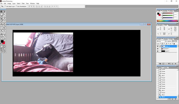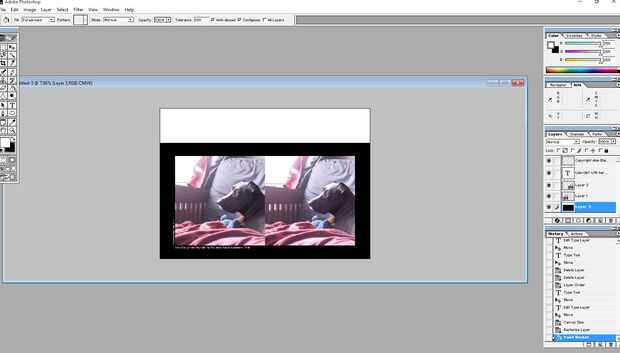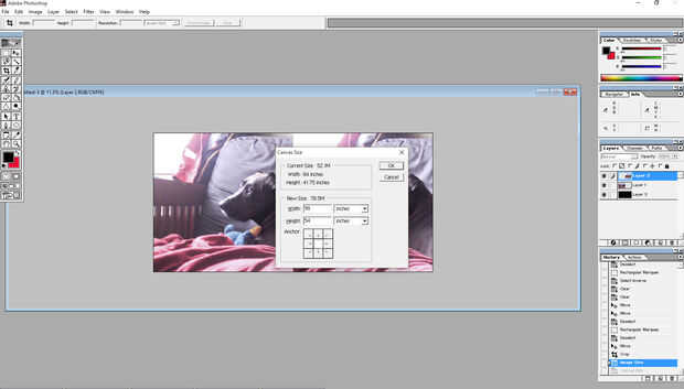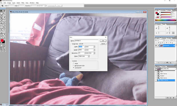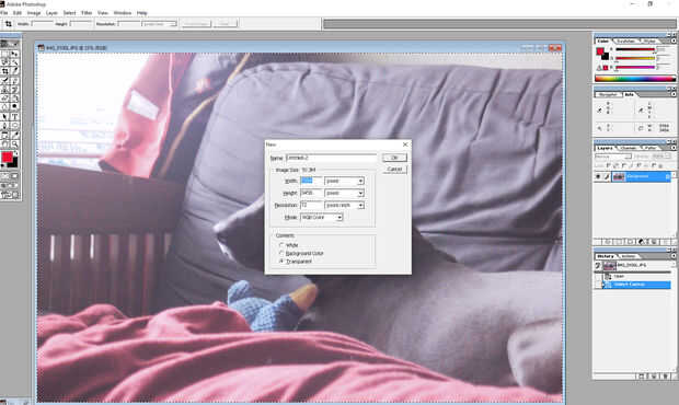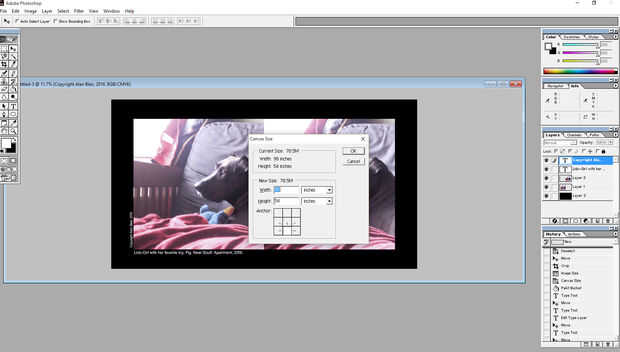 Así que tenemos que hacer aquí algunas opciones que dependen de cómo le gustaría imprimir y montar estos, que es el siguiente paso. Pero si usted quiere una tarjeta puede imprimir todo y montar en cartulina, divide el múltiplo de seis (24 y 12 en el ejemplo anterior) y aumento de tamaño de ancho de la lona por esta cantidad (hasta 24/6 = 4 "ó 12/6 = 2") con la imagen queda centrada. Aumente la longitud de la tela por la mitad de la anchura creciente (2" o 1" de arriba). Crear una capa de fondo y relleno. Imprimir en 5 x 7 en su lugar más cercano Foto impresora (incluso objetivo está bien) en modo apaisado. El ancho debe ser perfecto, impresión en 7" con 6" de la foto, pero vas a tener que recortar la parte superior e inferior. Alternativas en el paso siguiente.