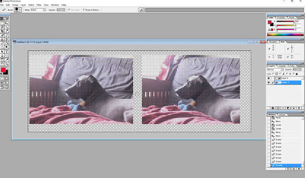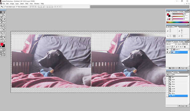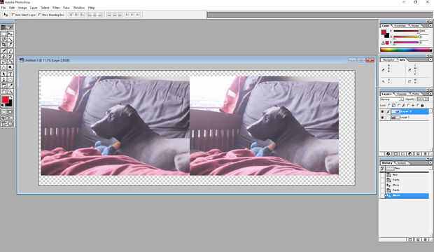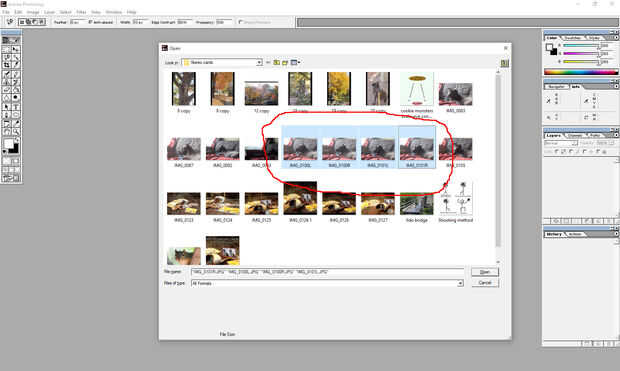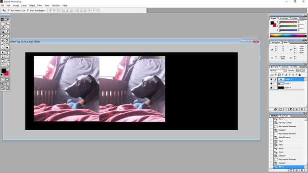 Lo primero que me gusta hacer es renombrar los archivos. Así que si tengo 20 fotos en mi tarjeta, numerada 0001-0020, va cambiarles 01L, 01R, 02 L, 02R hasta 10L y 10R. Entonces voy a hacer un nuevo archivo con un tamaño de lienzo más grande que dos veces la anchura de una foto, y con suficiente longitud para darme algunos margen de maniobra. A nombrar esta simplemente el número de ambas fotos para que 01L y 01R son importados en el nuevo 01 archivo. Ahora si hacer cambios globales (niveles, contraste, etc.) Yo puedo fácilmente aplicarlos a ambas capas a la vez. Ahora estoy listo para alinear.