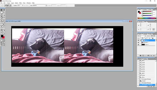 Cultivo: Ahora tenemos que recortar todo lo que está en una foto, pero no la otra, en su mayor parte. Ya que yo he importado dos fotos al mismo lienzo puedo ver ambos al mismo tiempo, pero yo no puedo recortarlas tanto. Selecciono la herramienta de marco rectangular y recortar el exceso de cada foto. También puede usar la goma de borrar mientras mantiene pulsada la tecla Mayús. Lo que funcione para usted.