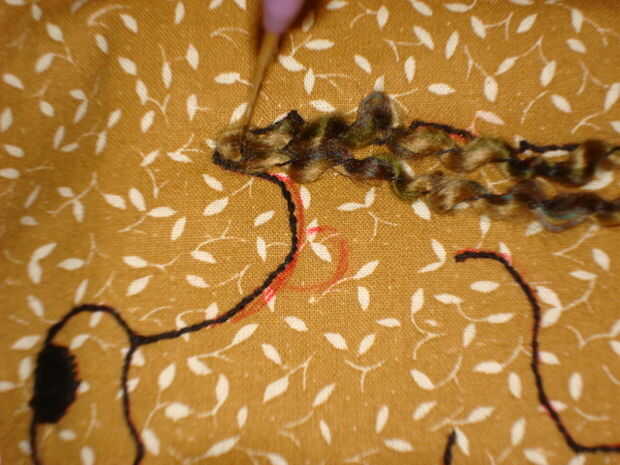 Usando la aguja en posición vertical empezar a meter en el hilado a través de la tela y en el bloque.