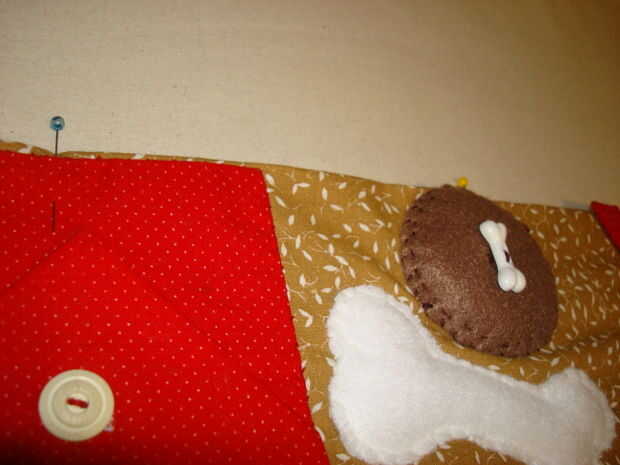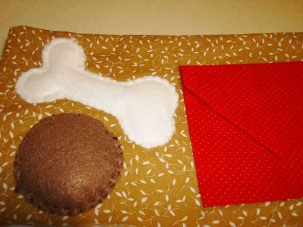 Organizar la cookie, el bolsillo y el hueso de perro como se muestra y pin en su lugar mientras que su mano coserlas a la tarjeta de la tela.