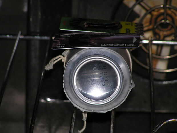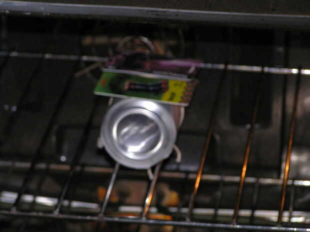Equilibrar las 2 tarjetas en la parte superior de la lata, entre la cadena (o usar 2 latas). Coloque cuidadosamente la lata en el horno, sin golpear las cartas. Sólo estoy usando las tarjetas telefónicas para fines de demostración, no van a calentar porque no sé cómo reacciona al calor. Estoy usando para mostrar la colocación de las cartas encima de la lata.