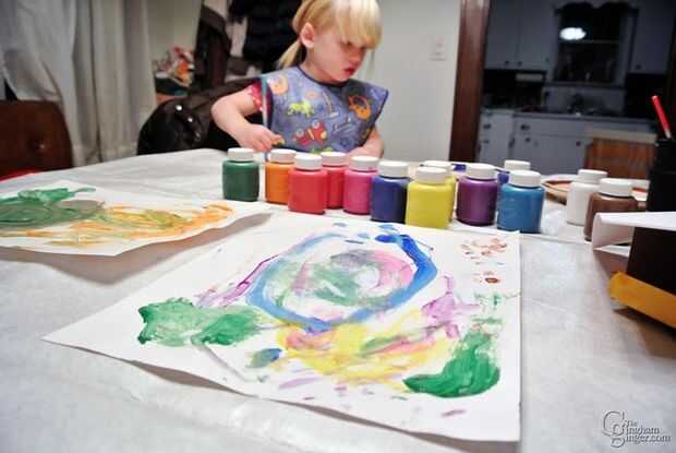 Coloque el paño sobre una mesa. Puesto artesanal suministros para niño escoger. Poner poco de pintura en un plato. Para niños de 1-2 años recomiendo usar sólo un par de colores como realmente aman totalmente mezclarlos juntos hacer todo marrón. Tienen al menos 2 pinceles así que usted puede limpiar uno en la taza de agua cuando el niño quiere cambiar colores. Esto ayudará a evitar que sumergir un color a otro. Que hijo de pintura en el papel de la impresora. Despedir a pinturas acabados para el lado que se seque.