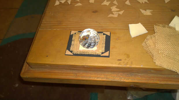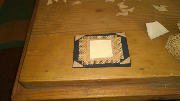 Pegamento del hessian con una fina línea de pegamento en los cuatro lados, luego diagonalmente de esquina a esquina, pegue en la tarjeta.