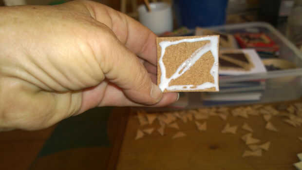 Cortar dos cuadrados de corcho. Corte diagonalmente para hacer triángulos.