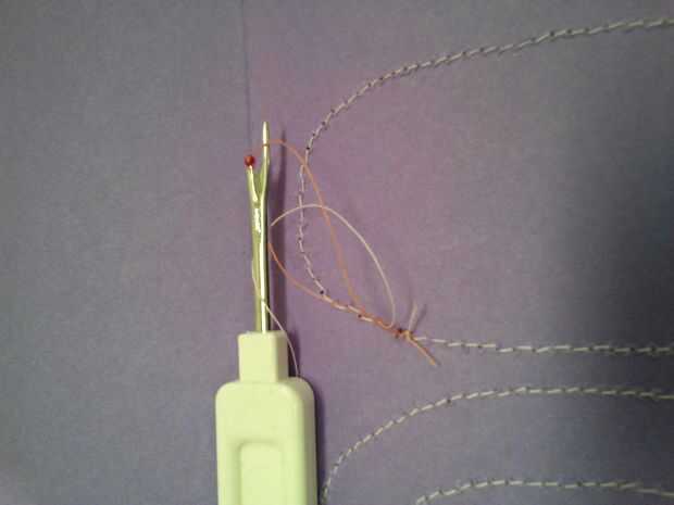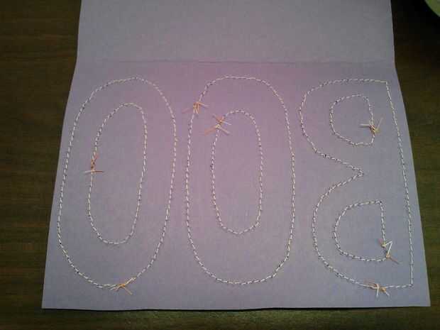 Si sus cartas son grandes, puede coser alrededor del borde exterior de la carta y luego otra vez en el interior de la letra. Si las letras son más pequeñas, (como la tarjeta de feliz cumpleaños) sólo puede coser en el centro de la carta. También, en lugar de pespuntes para evitar que la costura de deshaciendo, dejar por lo menos 6" de hilo colgando (en los puntos inicial y finales) y tire suavemente en el hilo de la canilla hasta que una pequeña cantidad de hilo se tira a través a la parte posterior. Utilizar al destripador de la costura, coge el lazo de hilo y seguir tirando a través a la parte trasera de la tarjeta. Atar el hilo a hilo de la bobina en un nudo y corte el hilo sobrante.
