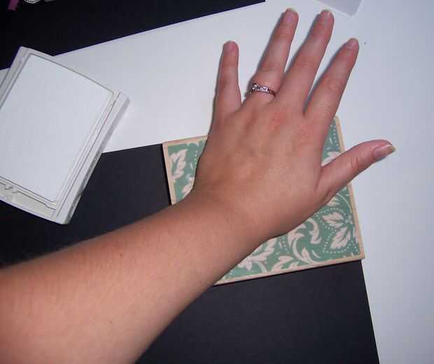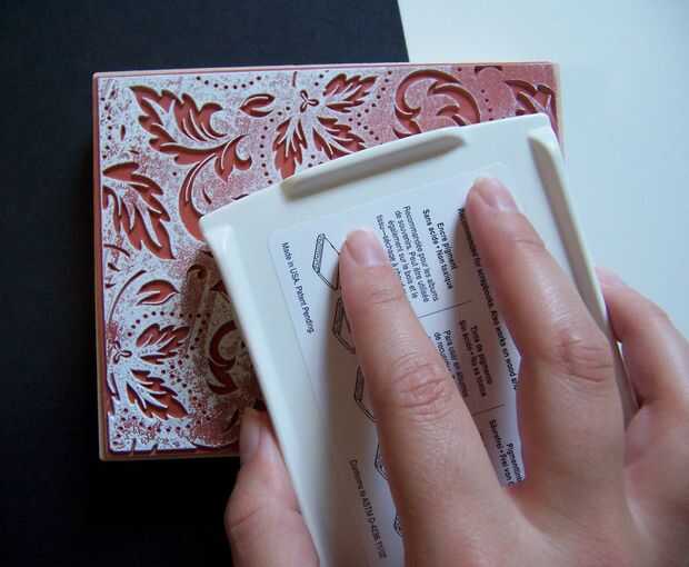 Sello de fondo de tinta con tinta de pigmento blanco y sello en cartulina negra, sellado tantas imágenes como puede caber en una sola pieza de cartulina (que será cortar aparte más adelante).
