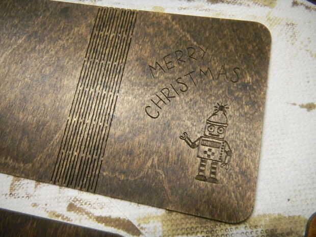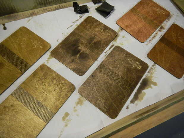Utilice un pincel de punta fina para aplicar tinte en las zonas grabadas de la tarjeta. La mancha aparece ligeramente más oscura en las áreas grabadas porque la madera interior se expone el proceso de grabado.