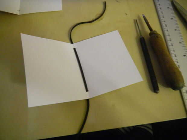 Preparar el relleno de papel doblando una hoja de papel de A6 a la mitad. Utilice una herramienta de perforación para perforar un agujero en la parte superior e inferior del pliegue, de un centímetro de cada borde.