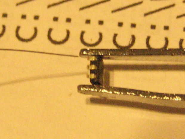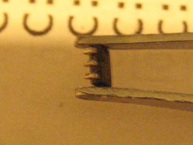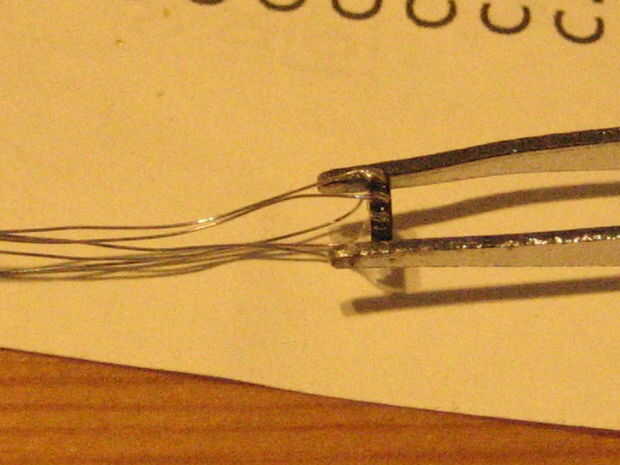 Haber programado las fotos, ahora tendrá que conectarlos a los cables. Utiliza los filamentos individuales de un cable para esto (sobre 30ga) y había estañado de cables de la foto, primero soldar un cable a cada pin. Un par de pinzas con una función de bloqueo es muy útil para esto, como puede sostener firmemente el PIC mientras se suelda.