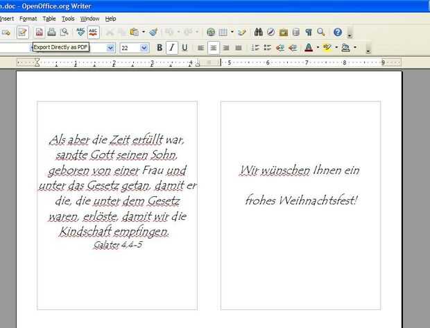 Formateado las inscripciones de mi tarjeta con software de procesamiento de textos de OpenOffice.org 3.0.  Mi impresora no acepta cualquier cosa más de cerca de 9 pulgadas.  Mi tarjeta es abierto, es 10 pulgadas de ancho.  Necesitaba una manera de convertir mi documento un cuarto de vuelta.  He decidido guardar en formato PDF e imprimir desde este fichero.  El software de OpenOffice.org permite hacer un PDF con un solo clic en el botón PDF en la barra de herramientas.  Ver la parte superior izquierda del gráfico.