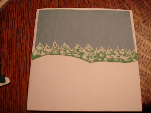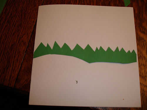 Para la escena del árbol, cortar un patrón de zigzag triangular de papel verde, bajo los puntos de corte un par de curvas para agregar algunas colinas nevadas. Usando un papel azul o negro, corte algunos cielo poner detrás de los árboles. Pintar algo de nieve en los árboles y añadir cualquier otra información que desea.