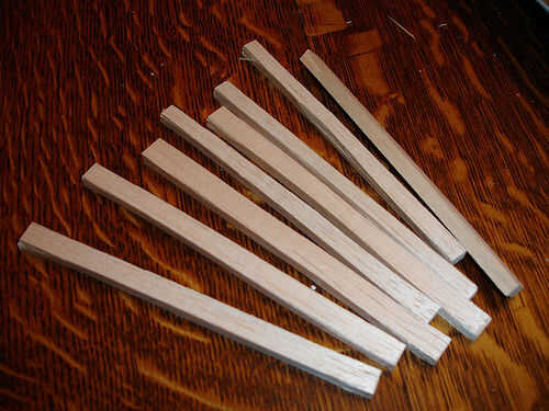 Para cada tarjeta, corte 4 palos largos fuera de la balsa grueso 1/4 de pulgada. Hacerlos como todo o como fino y desea, pero en algún punto entre 1/4 y 1/3 pulgadas son probablemente óptimo.