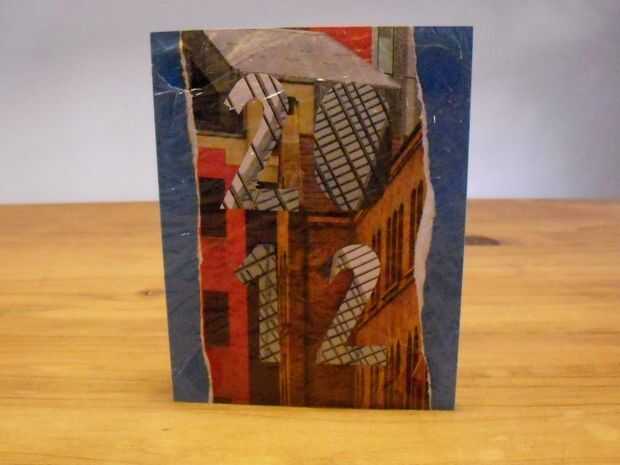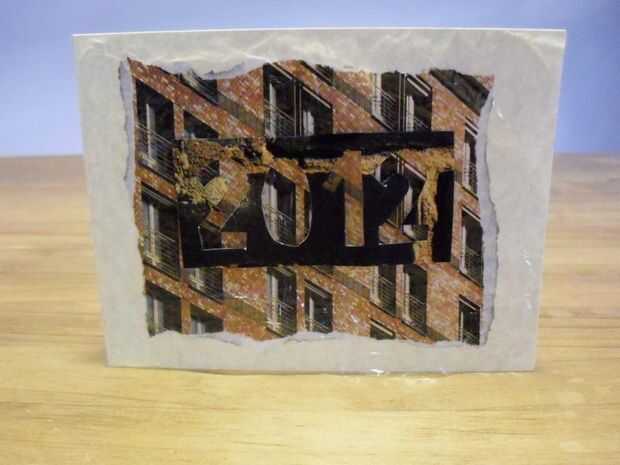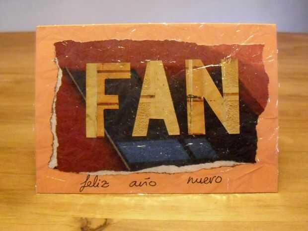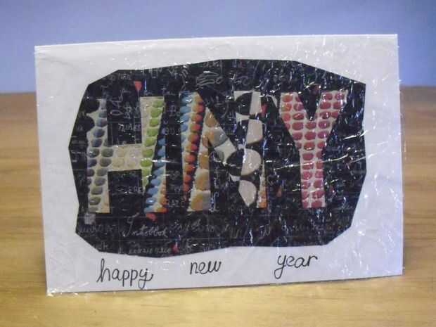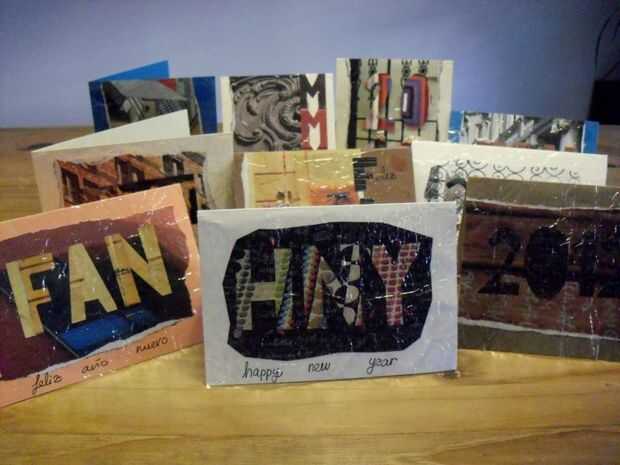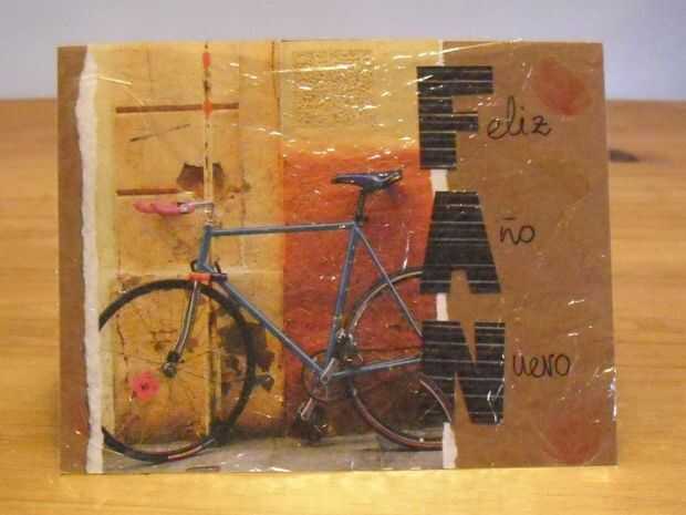 ¡ Hola a todos! Vuelvo con mis nuevas tarjetas de felicitación para las próximas Navidades. La técnica es muy fácil: recorta o rasga fotos de revistas, recorta algunas letras o números (p.ej.. 2012, HPN para feliz año nuevo en inglés, ventilador para Feliz Año Nuevo en español...) y pégalo todo sobre una cartulida doblada. El toque brillante lo da el celofán transparente arrugado, pegado sólo por las cuatro esquinas.