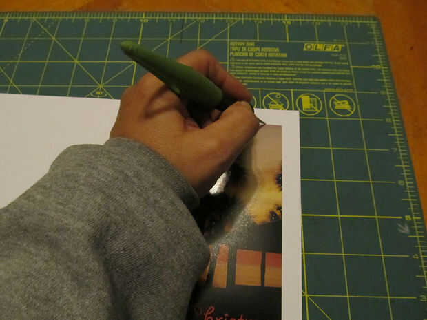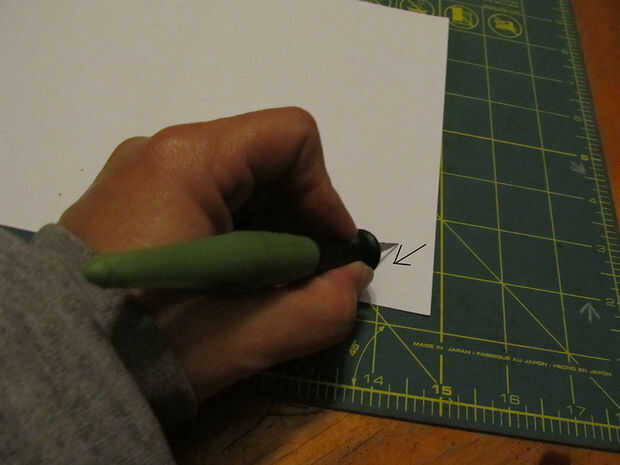 Después de todas las tarjetas se imprimen. Ponga que su tarjeta abierta, tome una de sus impresiones de la foto pone la manera que usted quiere que sea en tus tarjetas de acabado. Entonces apuñaló a pequeños agujeros en cada esquina de la tarjeta para "marcar" donde quiero las ranuras en la tarjeta. Ir alrededor de las 4 esquinas de la tarjeta de la colocación de la tarjeta de la marca. (puede usar un bolígrafo o un lápiz para marcar la colocación de la tarjeta, pero muestran en el producto final)