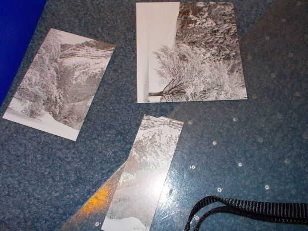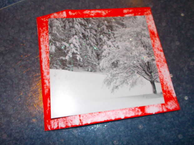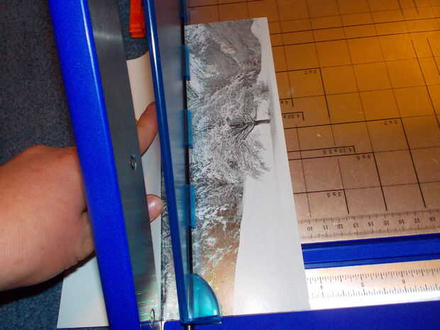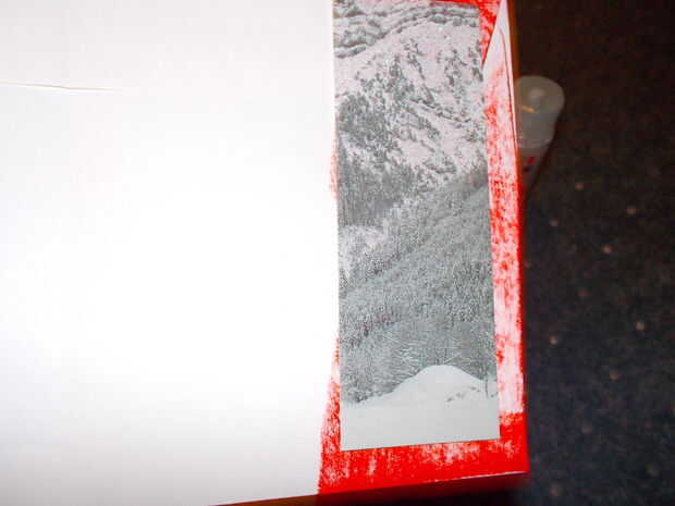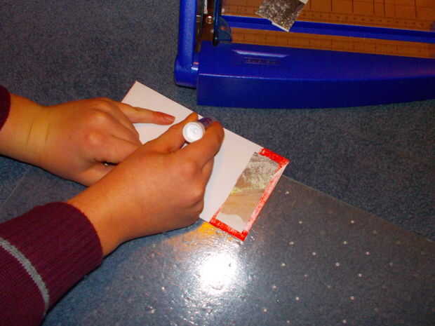 Cortar la cartulina con un cortador de papel para que la acción se centra con un pequeño borde. Hacer esto para el frente, hacia atrás, y el extra un poco por encima de la ranura. Sobres de pegamento después de pegar la pieza más pequeña hacia abajo.