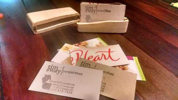 OK, tal vez esta idea de tarjeta de visita no es para todos, pero puede ser para usted. tuve un sello hecho por cerca de $20 y corté 20 tarjetas de una sola caja de cereal y sello de la parte posterior. cada tarjeta tiene un diseño único (a veces un genial, pop-art-ish look!), lleva toda la información que necesita y es respetuoso del medio ambiente. muy simpl. ver el vídeo de 2 minutos.