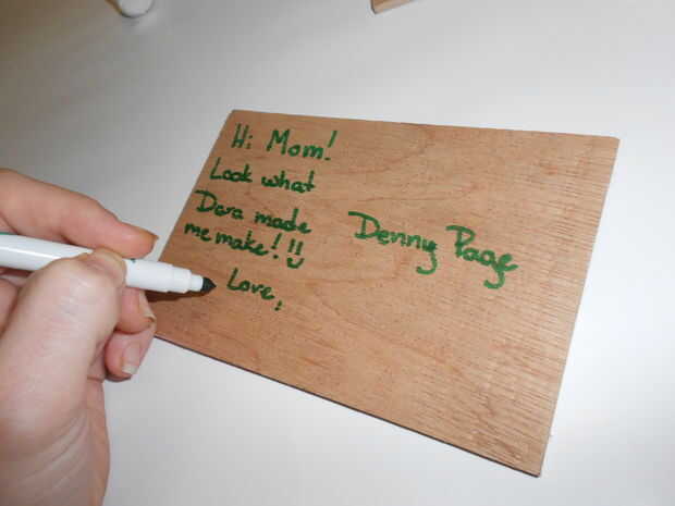 Tenga en cuenta, madera sangra con mucha tinta. Sharpies y otros mensajes de marcador pueden ser bastante breves. Si utilizas algo como pintura de camiseta en uno de los corrales tienen para eso, va a ser bastante precisa, pero tendrás que esperar un poco rato más para que se seque.