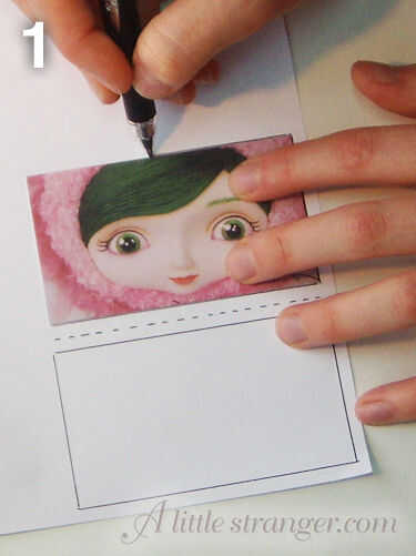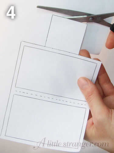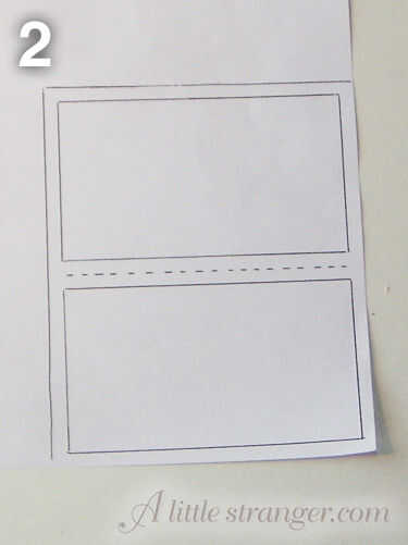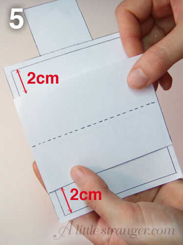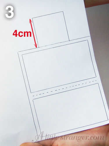 5) cortar otro cuadrado del mismo ancho que la plantilla principal, pero 2 cm más estrecho que su tarjeta de visita. Se trata de la bolsa que su tarjeta de visita. La línea punteada indica el pliegue central en el soporte.