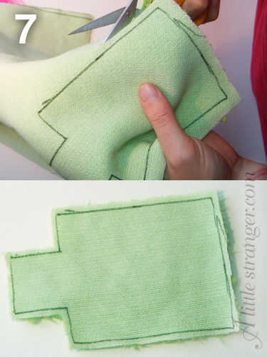 8) tip: recortar la piel en el margen de costura de 5 mm alrededor de esta pieza. Esto dejará de conseguir exceso de piel en las costuras y los makin voluminosos.