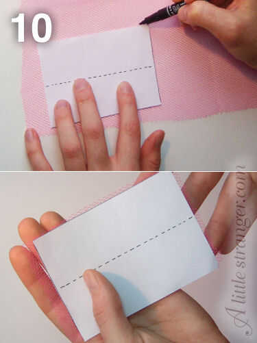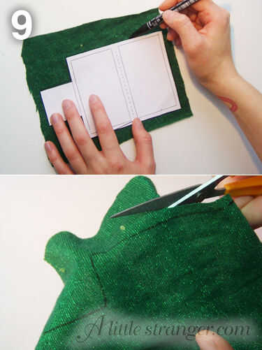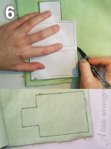 10) marcar su bolsillo de tenencia tarjeta. Dibuja alrededor de la plantilla en el tejido elegido. Recórtalo dejando un margen de 5mm en ambos los lados cortos.
