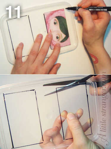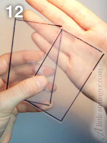 11) paso opcional: traza en torno a su tarjeta de visita dos veces en el plástico y cortar dejando un margen de 2 mm a todo alrededor. Corte las esquinas filosas o estos podrían empujar a través de la tela cuando el titular de la tarjeta está cerrado.