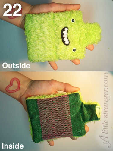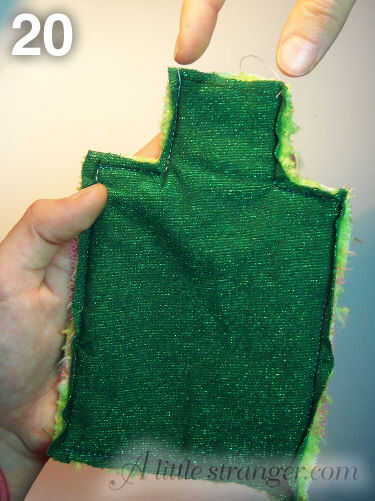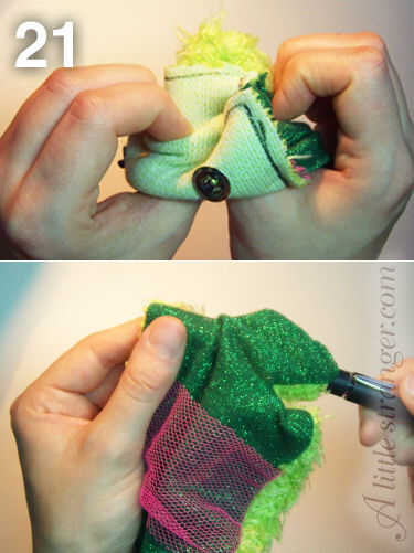 21) le gire hacia la derecha, empuje sus dedos pulgares en el borde inferior y empujar el tejido hacia arriba y fuera el vacío dejado en la pestaña superior.