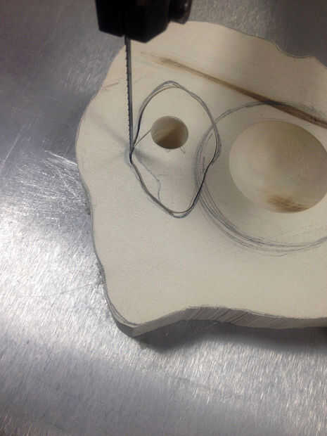 Cuando se observa el hueso de la cadera, verá que hay una sección que se elimina totalmente. Así que con 1/2 broca corta un agujero a través del centro de esta sección. Con el corte del agujero ahora puede insertar la hoja de una sierra de contornear a través de este agujero. Con cuidado, cortar esta forma para representar con exactitud esta construcción ósea específica. Ahora estás listo para moler y forma!