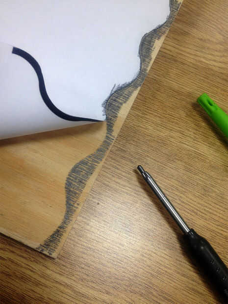 Elegir una pieza de 5 "x 12" holly wood permitida la mejor representación del hueso. Holly tiene esta notable brillante color blanco y grano sutil que se alinea perfectamente con la apariencia de hueso humano. Lo primero fue separar la pieza de madera en dos secciones. Esto se hace para acceder a las tarjetas de visita que se incrustará dentro y para que se vea como el hueso está roto. Busca en Google "línea ondulada" imprimir y recortar para crear una plantilla. Tomar un lápiz trazó la línea ondulada en un pedazo de chatarra 1/4" madera contrachapada. Corte hacia fuera con una sierra de contornear mi plantilla para utilizar un router a continuación establece.