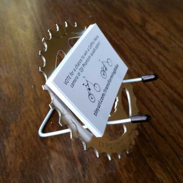 unas muletas de metal, un par de ruedas de bicicleta y tubos interiores, y unos tornillos junto con algun aislante y un pedazo de madera contrachapada y los ingredientes para un taburete. Un taburete de altura regulable.Mención de este proyecto deber