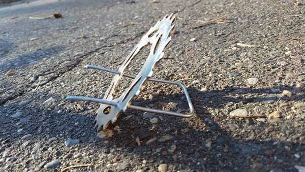 unas muletas de metal, un par de ruedas de bicicleta y tubos interiores, y unos tornillos junto con algun aislante y un pedazo de madera contrachapada y los ingredientes para un taburete. Un taburete de altura regulable.Mención de este proyecto deber