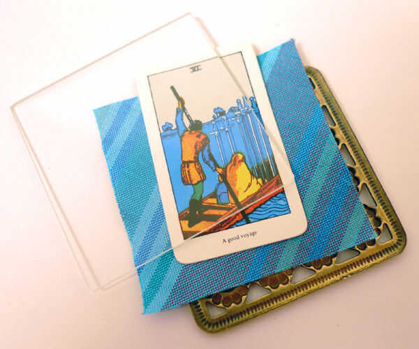 Coloque una pequeña cantidad de pegamento o un trozo de cinta de doble cara en la parte posterior de la tarjeta de tarot. Coloque la tarjeta en el centro de la Plaza de la cinta. Pila de la placa de daisy, la Plaza de la cinta y el portaobjetos de cristal para que la tarjeta del tarot muestra a través del vidrio.