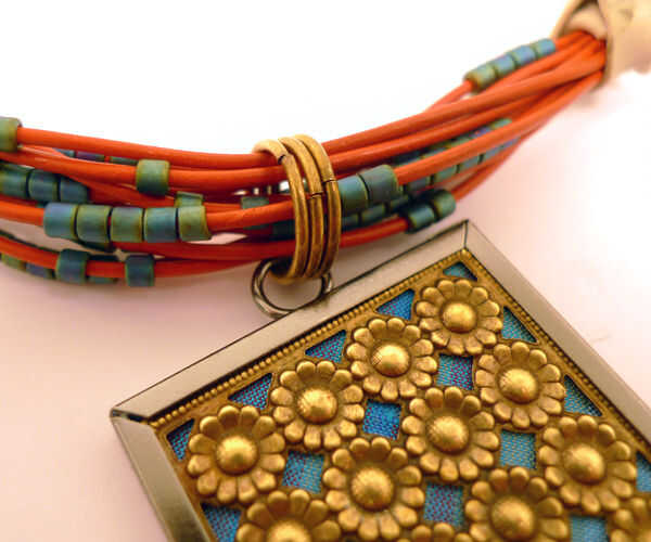 Uno de los anillos de salto 14 mm usando sus alicates de cadena abierta. Pase a través del lazo en el colgante y todo el cuero incluido. Cierre bien y repita con el resto anillas.