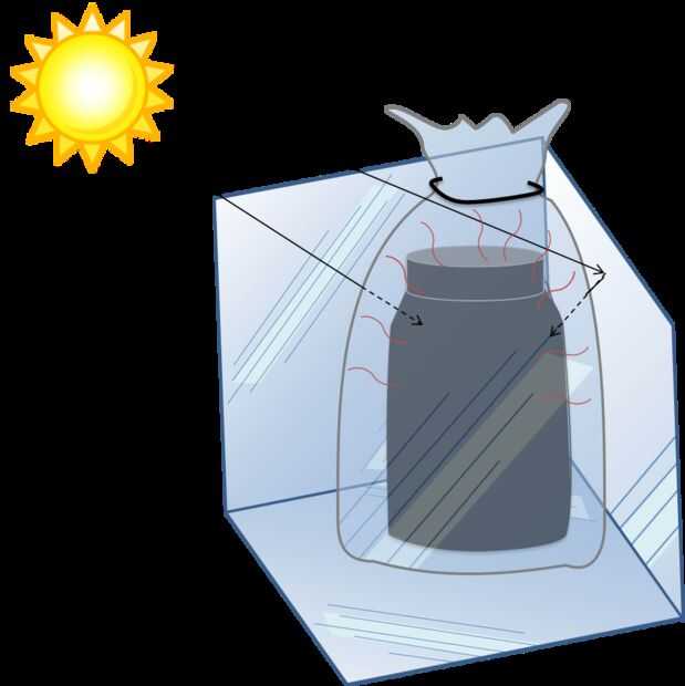La idea básica es utilizar el calor de la luz del sol capturada en un envase que contiene alimento ó el agua cocinar a calentar agua para pasteurizar para hacerla segura para beber.
