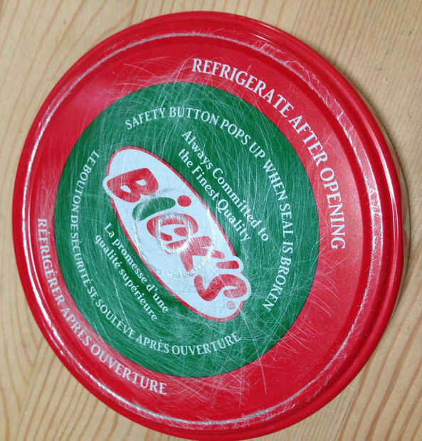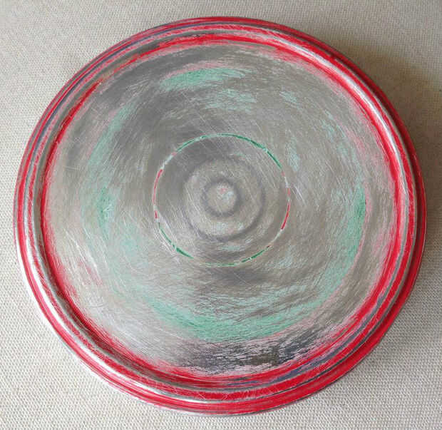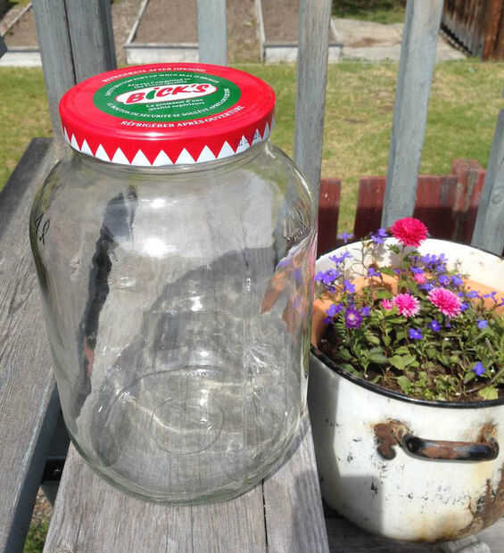 Retire la tapa de tu frasco de salmuera 4L. Sostiene una media pieza gruesa de papel de lija (grano 150) en la mano, movimientos circulares de hacer después de la forma de la tapa para eliminar cualquier posibilidad de leer las palabras, dejando todavía toques de color aquí y allá, para darle a un diseño rústico, desgastada mirada.