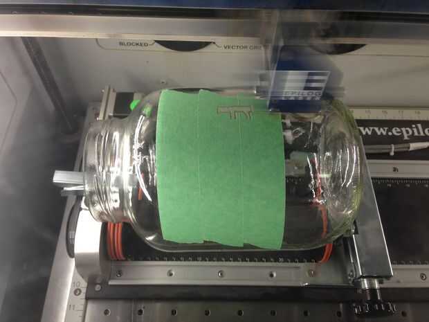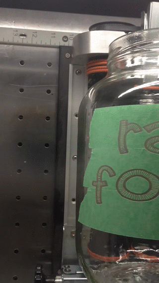 Configurar tu plantilla rotatoria en el cortador del laser y luego coloque la jarra enmascarada. Usé el complemento de clip de metal, para agarrar el borde libre de la jarra para ayudar a mantener en su lugar cuando gira.