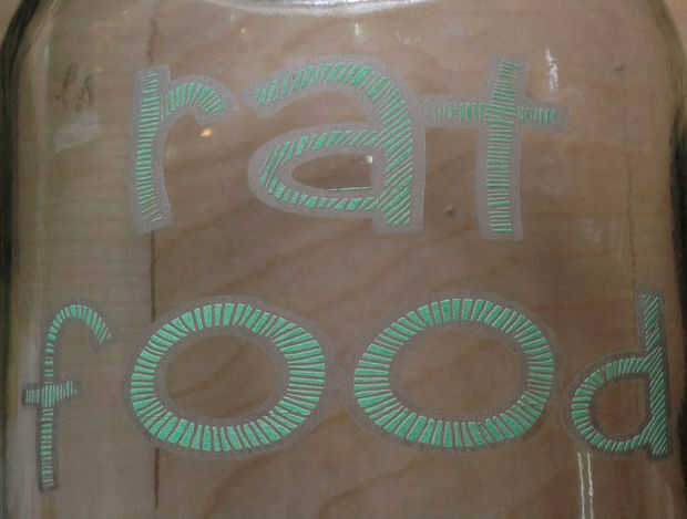 Retire el frasco grabado al agua fuerte de la plantilla y retire la cinta alrededor para revelar su etiqueta. He dejado las líneas verdes internas de cinta en las cartas por el momento, porque el color felicitó a la tapa y hace aún más fácil de leer! (Cuando la cinta comienza a desaparecer, se retire la cinta restante para exponer completamente la etiqueta de cristal al ácido).